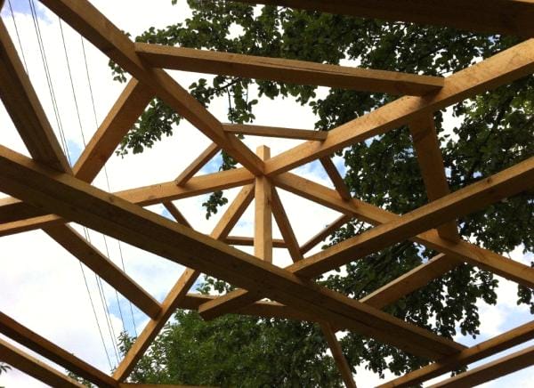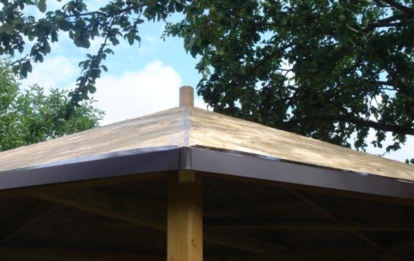 Если крыша шестигранной беседки будет накрыта битумной черепицей, то под нее нужно уложить плиту ОСП. Для ее монтажа к стропилам крепят доски обрешетки.
