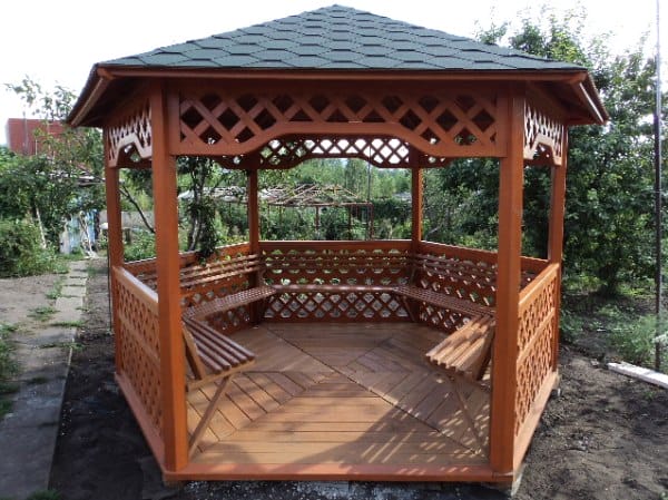 Скамейки в беседке с решетчатым заполнением логичнее сделать не сплошными, а из наборных брусков. В этом случае сооружение будет одинаково хорошо смотреться и снаружи, и изнутри.