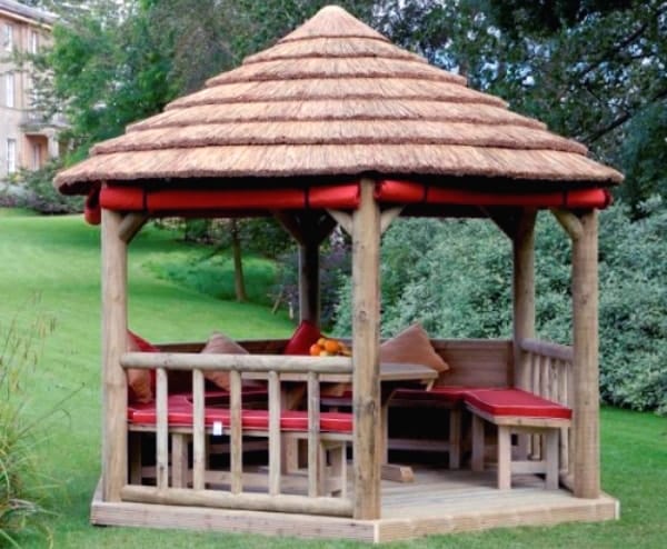 Декорирование в стиле кантри очень популярно в дачном дизайне. Для воплощения этого стиля в качестве кровельного покрытия используют речной тростник или деревянный гонт. Каркас такой беседки должен соответствовать общей стилистике. Поэтому для стоек лучше взять не обрезные балки, а освобожденные от коры и отшлифованные бревна.