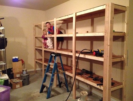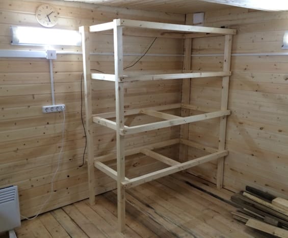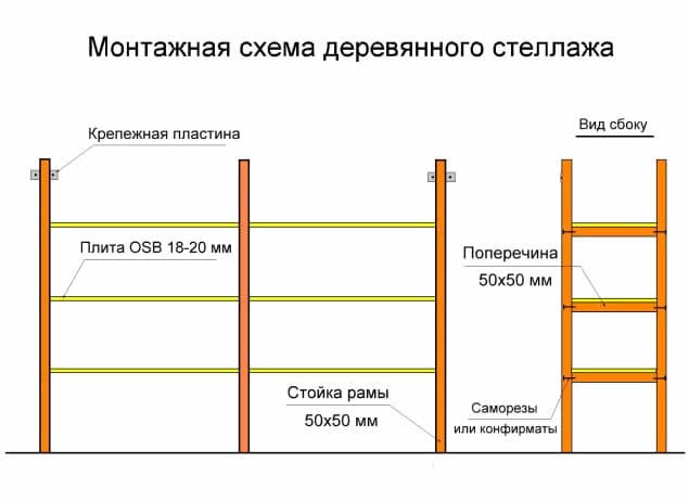Оптимальный материал для деревянной стеллажной конструкции — строганные бруски сечением 5х5 см и плита OSB.