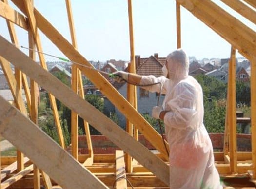 В большинстве случаев нанесение огнебиозащитного состава нужно выполнять при плюсовой температуре воздуха, поскольку замерзшая в капиллярах древесины вода мешает проникновению пропитки. Не следует проводить такие работы в дождливую погоду.
