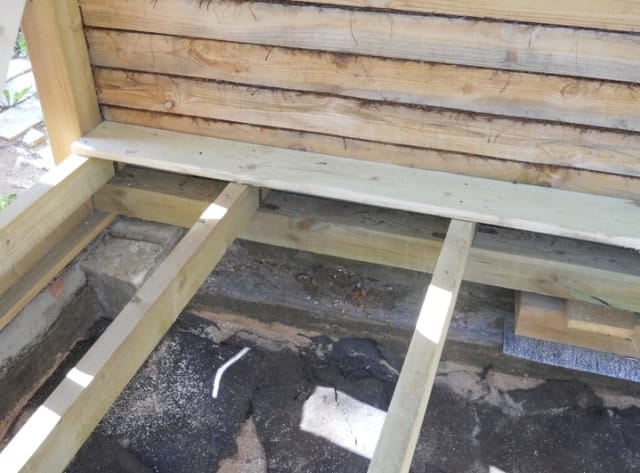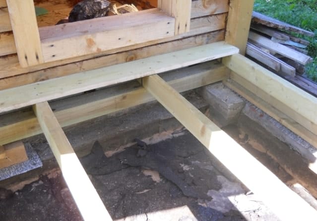 Все бросили, ставим лаги. На веранде решили настелить только черновой пол с утеплением базальтовой ватой. Всю голову сломал пока придумал, как уложить базальт. Оказалось, что все гениальное просто: к нижней плоскости половых лаг (брус 200х50 мм) прикрутил на шурупах 150 мм доску. На получившиеся по краям выступы уложил обрезки досок, а по ним расстелил базальтовую вату. Все, можно укладывать половую доску!