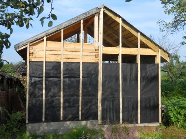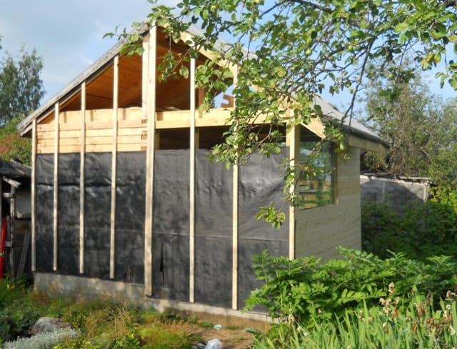 На каркас под внешнюю обшивку крепится ветрогидроизоляция. На стройрынке огромный выбор всевозможных пленок, мембран. Несмотря на это, я как всегда полез на форум. Там подошли к проблеме иначе. Долой дорогущие изыски, сделаем просто и дешево. Ставим пергамин (он же толь) на всю баню. 4 рулона купил за смешные деньги. Крепил его к стене строительным степлером. Поверх пергамина вертикально набил 50 мм рейку. Ее обязательно нужно ставить вертикально, чтобы под обшивкой было движение воздуха и не скапливалась сырость.