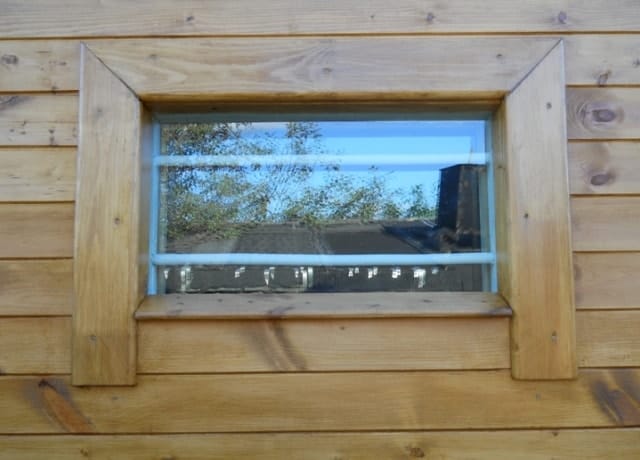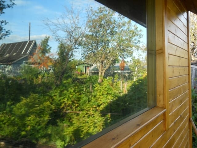Окно решил сделать глухим. Заказал большой двойной стеклопакет и сделал для него усиленный жесткий проем. Под нижнюю плоскость стеклопакета для герметичности уложил резиновую ленту. Выровнял стеклопакет по вертикали. Его края и верх залил строительной пеной. После ее высыхания срезал излишки ножом. По краям окна поставил декоративную окантовку из бруска.