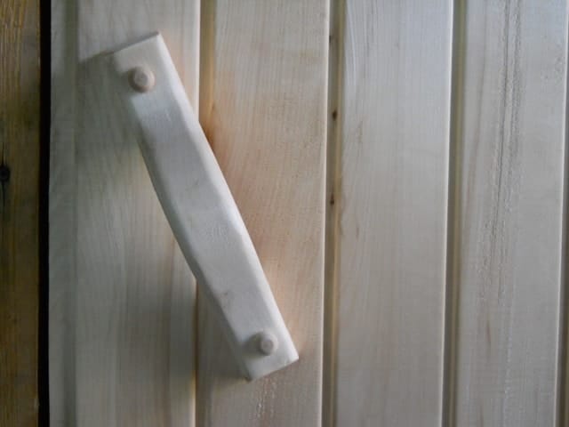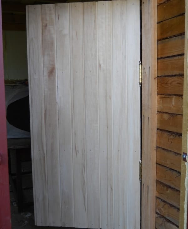 И все же сделал дверь сам. Легкую, утепленную пенопластом, обшитую осиновой вагонкой. Делал в первый раз, как говорят, «на колене». Тем не менее, получилось качественно и красиво. Прикрутил к двери импозантную деревянную ручку.