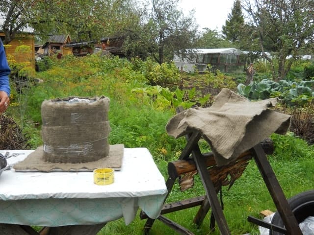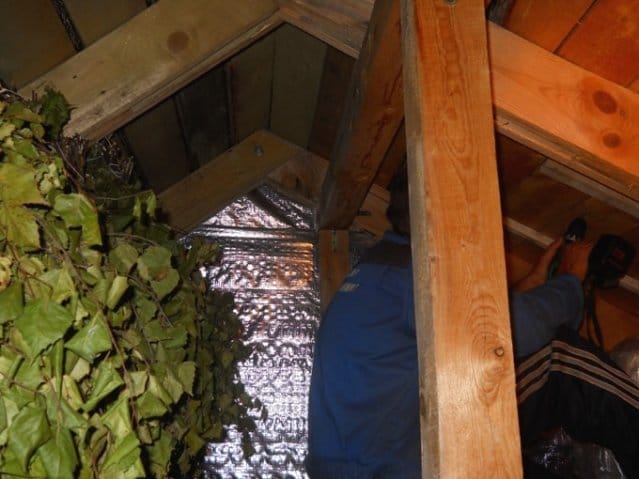 Печку собирать — одно удовольствие. Как ни как, это последний этап стройки! Еще раз проверил прохождение печной трубы между потолочных балок и стропил крыши. Все сделано верно, единственный недочет: на крышу труба выходит рядом со стропилом. Поэтому я изолировал стропило базальтовым полотном, а саму трубу обернул асбестовым полотном. Асбест — жуткий канцероген, поэтому поверх него оборачивается базальтовое полотно. Работать с асбестом нужно только в респираторе!