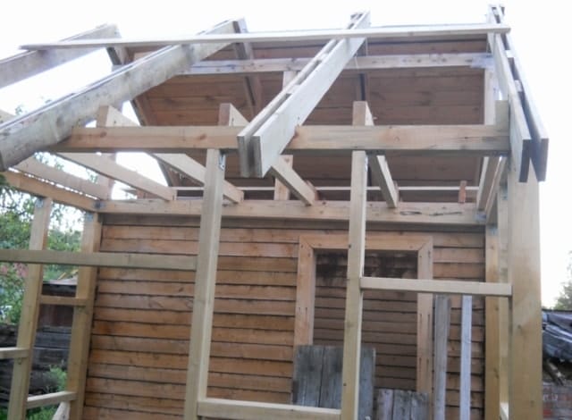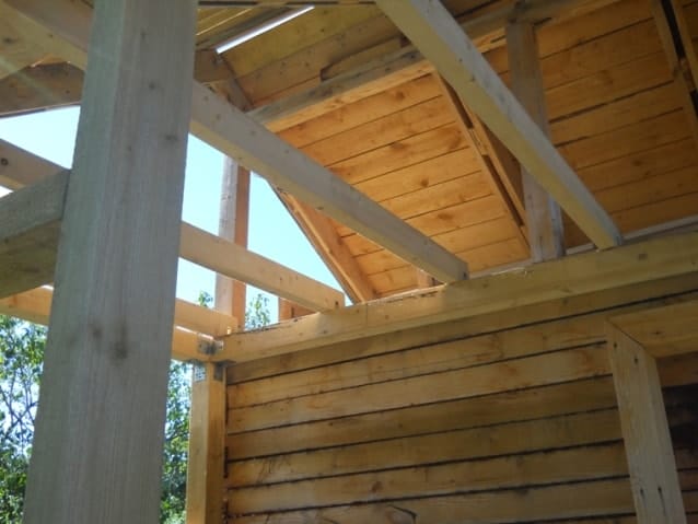 Итак, стропила уже стоят. Теперь нужно обшить их обрезной доской да расстелить два слоя рубероида. Вот крыша и готова. Скажу попутно, что рубероид и крыша — не совместимые понятия. Рубероид это временная кровля на два — три года, пока не будет установлена постоянная кровля из шифера, керамической или металлочерепицы.