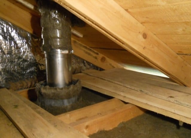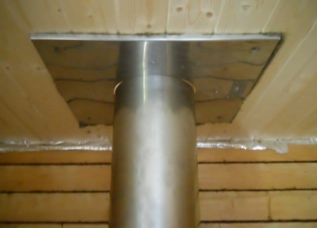 Далее на трубу надевается шибер или попросту задвижка. Ее можно и не ставить, это на любителя! Дальше самое ответственное: место прохода трубы через потолок. В потолке вырезается отверстие под ППУ (потолочное проходное устройство). Все места контакта ППУ с деревом термоизолируются асбестом.