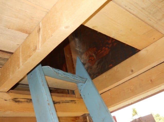 Дальше работа пошла быстро. Только окно вставили, сразу беремся за дверной проем. Полез на чердак за доской. Ну, раз залез, то надо и половые лаги поставить. Это же не долго! Ведь песок засыпали, разложили рубероид. По нему же ходить не будешь!