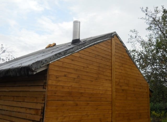 Начертил на крыше по шаблону отверстие. Тонким сверлом при помощи дрели насверлил его контуры и с крыши прорезал лобзиком. Вывел последнюю сэндвич трубу на крышу. Чтобы по трубе внутрь бани не стекала вода, одел на нее «мастер флеш» (термостойкий резиновый рукав). К верху трубы крепится пламегаситель или попросту зонтик. Все! Можно сказать, баня сделана.