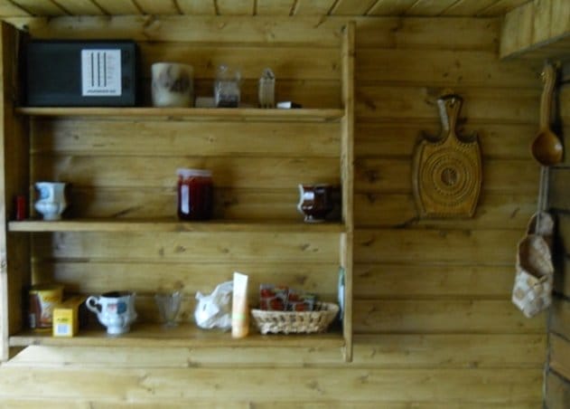 В углу повесили плетеные лапти, по стенам развесили резные доски и деревянные ложки!