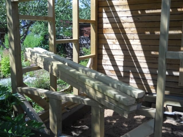 В мае погода изменчива и капризна. Утром солнце и чистое небо, к вечеру нагонит облака и зарядит дождь, а у нас даже стропил нет! Монтаж стропил — ответственный этап стройки. Верхний конец стропил веранды я крепил к стропилам бани, так что получилась общая крыша.