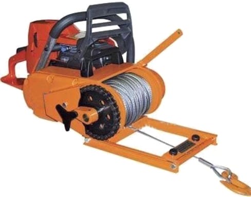 Мощность такой самоделки зависит от мощности использованной бензопилы, а ее тяговое усилие может достигать 1500 кг. Такая лебедка должна быть оснащена стропальным ремнем, крюками и анкерами для крепления к грунту, стволу дерева или автомобилю.