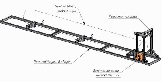 Удерживая пилу на весу в руках очень сложно проконтролировать точность всей длины реза. Поэтому при трех или четырехметровой длине бревна он сильно уходит в сторону от намеченной линии. Решить эту проблему можно довольно просто. Для этого бензопилу жестко фиксируют на раме, которая перемещается по направляющему профилю.