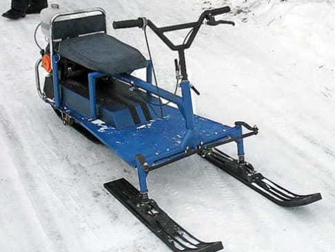 Легкий самодельный снегоход из бензопилы по конструкции сложнее пилорамы, поскольку здесь на руль нужно вынести газ, сцепление, а также позаботиться об амортизирующей подвеске несущей рамы.