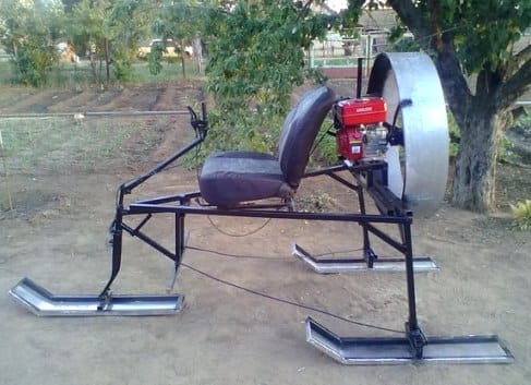Зимнюю линейку самодельных транспортных средств дополнят аэросани из бензопилы, которые конструктивно проще снегохода. Движущую силу им сообщает винт большого диаметра, который напрямую вращает бензиновый двигатель.