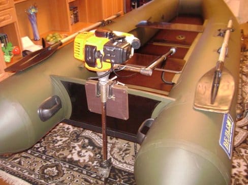 На фотографии показан вариант, в котором перед гребным винтом стоит редуктор, изменяющий на 90 градусов угол вращения вала. В более простых моделях обходятся без него, закрепляя двигатель на лодке так, чтобы вал был погружен в воду под небольшим углом.
