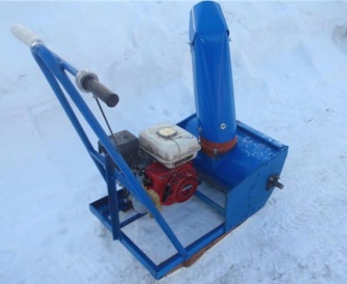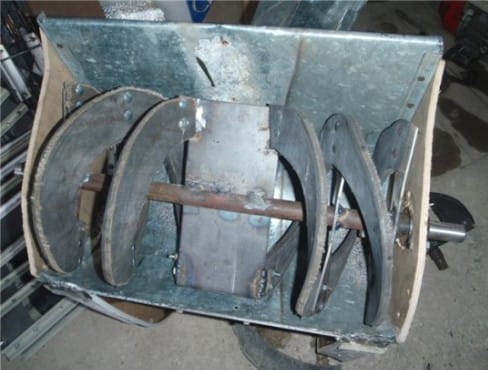 Самой ответственной частью, от которой зависит насколько хорошо самодельный снегоуборщик справится со своей работой, является шнековый узел. В движение его приводит шестеренчатая пара и цепь. Лопасти изготавливаются из толстой кордовой резины, а заборное устройство из листа оцинкованной стали.