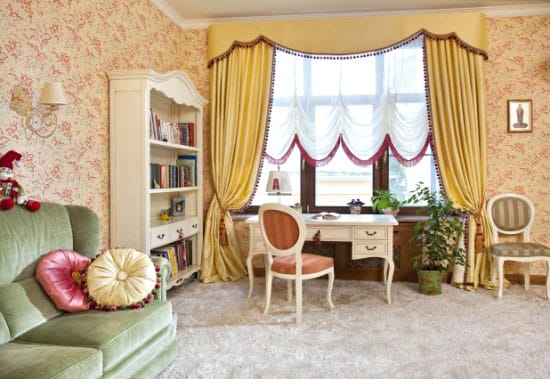 Цвет штор и мебели. Светлая мебель прекрасно гармонирует со светлыми обоями, а тёмная – с тёмными. Если шторы и обивка мебели декорированы, а также на стенах развешаны ковры, фотографии и картины, то здесь уместны будут гладкие обои или с мелкими рисунками.