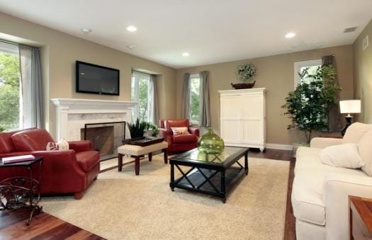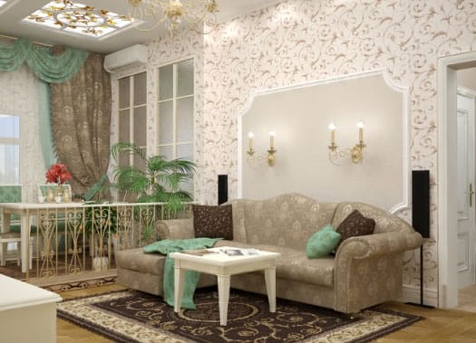 3. Гостиная, зал. Здесь также можно наклеивать любые обои. Так как в гостиной или зале в основном проходят все торжественные мероприятия, а также дружеские “посиделки” с друзьями, то для изысканного интерьера просто идеально подойдут велюровые (текстильные) обои, из фольги, имитирующие отделку сусальным золотом, или шелкография.