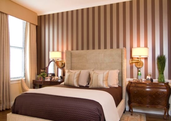 Широкое применение, кроме “цветастых”, нашли и обои “в полоску”, потому что отлично сочетаются практически с предметами различных стилей. Вертикальные полоски зрительно пространство комнаты уменьшают, но в то же время существенно увеличивают высоту потолка.