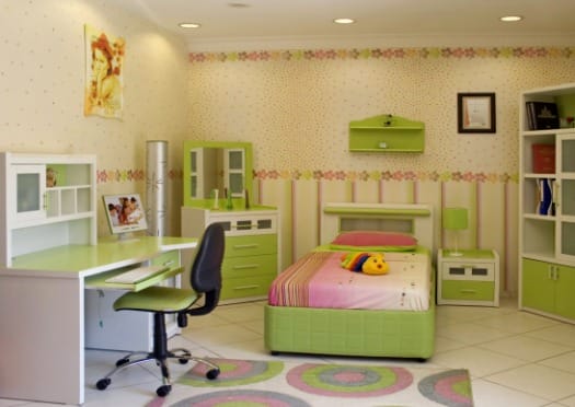 1. Детская комната. Всё чаще здесь используется зонирование разных участков, напрямую зависящие от их назначения. Для этого необходимо поклеить обои двух видов: в зоне отдыха (спальном месте) спокойные пастельные тона с белыми, бежевыми и жёлтыми оттенками, без крупных и ярких рисунков, а рабочую (зону активных игр и занятий) оформляем обоями с насыщенными яркими тонами.