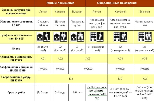 На российском рынке применяют классы ламината: 21,22,23 для бытовых условий ( до 5 лет) и 31, 32, 33 для коммерческого (производственного) применения (10 -25 лет эксплуатации). Данные классы указывают на интенсивность хождения. Малую, среднюю и высокую соответственно.