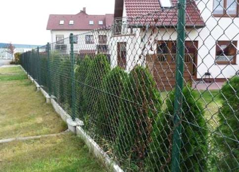 Вторые достоинство забора из стальной сетки — высокая скорость установки. Залив бетоном столбы, остается лишь раскатать сетку, натянуть ее и зафиксировать на столбах с помощью стальных хомутов.