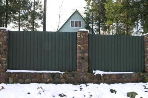Если бюджет ограничен, но хочется сделать забор на даче красивым и надежным, скомбинируйте натуральный камень на цоколе и столбах с заполнением прогонов листами профнастила.