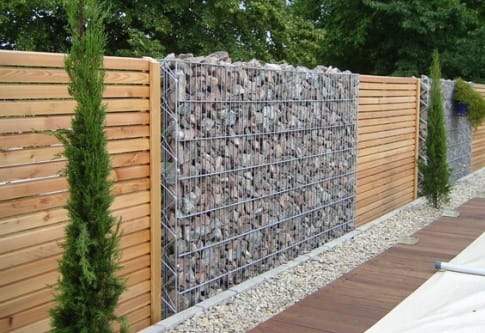 Тот же, кто любит оригинальные решения, наверняка выберет забор из габиона. Это очень интересная и необычная конструкция представляет собой решетчатый контейнер из стальной проволоки, наполненный камнем. Ставят такой забор, послойно заполняя блоки-контейнеры и закрепляя их между собой с помощью проволоки.
