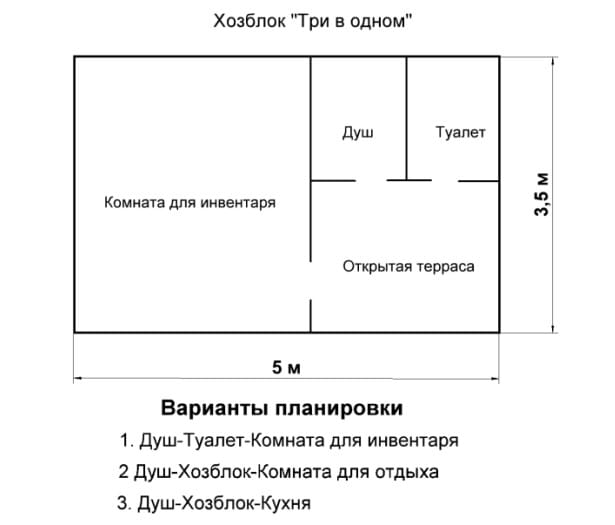 В этих словах есть доля житейской правды, поэтому мы рассмотрим вопрос о том, как построить хозблок своими руками более подробно. Для примера возьмем наиболее популярный среди дачников вариант с душем, туалетом и кладовкой.