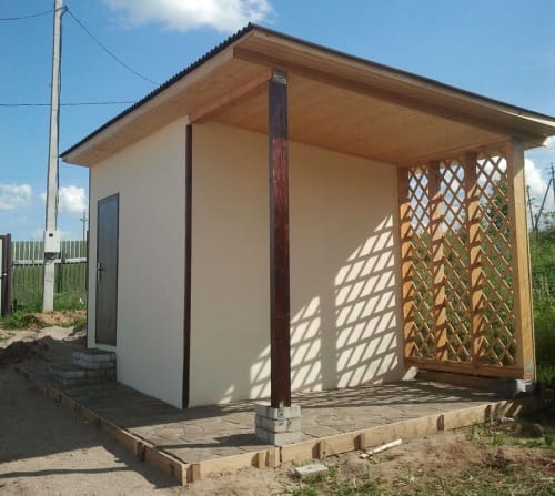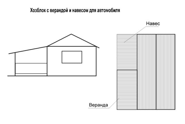 Начав строительство хозблока на даче, настоящий хозяин вряд ли ограничится тесным санузлом и кладовкой, а использует одну из его стен для пристройки гаража или небольшого навеса, где можно разместить дровник или небольшую открытую террасу.