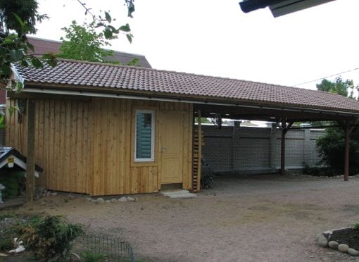 Общие затраты от этого увеличатся незначительно. Для этого будет достаточно дополнить хозблок легкой конструкцией из шифера, сотового поликарбоната или металлочерепицы.