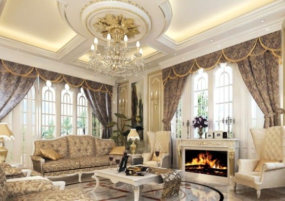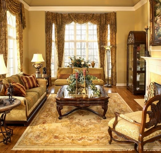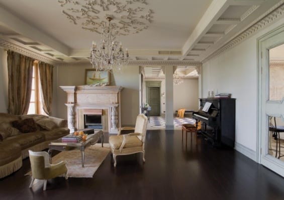 Можно использовать декоративную штукатурку или роспись. Стены украшают картинами в массивных рамах, чаще с позолотой. Пол должен иметь деревянное покрытие – паркет, доска. Приветствуется наличие камина.