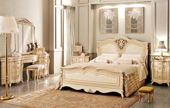 В зависимости от направления стиля кровать, непременно больших размеров, украшается балдахином или мягким изголовьем. Туалетный столик сочетается с мебелью всего помещения и занимает почетное после кровати место.
