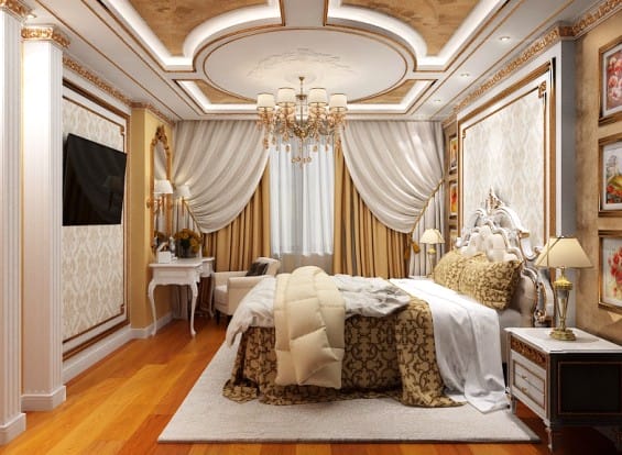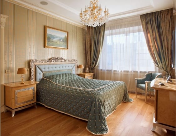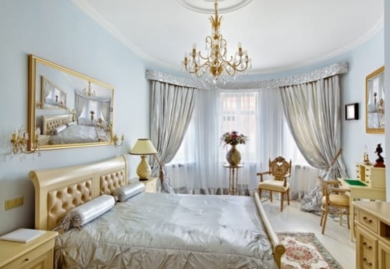 Классическая спальня оформляется по тем же принципам, что и остальные помещения. Она напоминает покои короля и королевы, выглядит дорого и добротно.