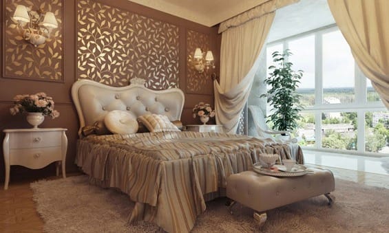 В качестве декора уместны картины в рамах, изящные статуэтки. Атмосфера роскоши сочетается с элегантностью и спокойствием. Благородные ткани, мягкий свет, грамотно подобранные аксессуары способствуют отличному отдыху и романтическим отношениям.