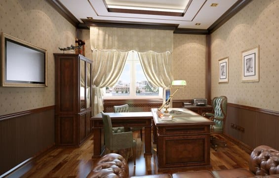 Кабинет в классическом стиле отличается дорогой отделкой стен и мебели: массивной, с использованием натурального дерева дорогих пород, кожи, металлической фурнитуры. Мужской кабинет обычно выдержан в более темной цветовой гамме. Главное место занимает массивный деревянный стол и удобное, чаще кожаное, кресло.