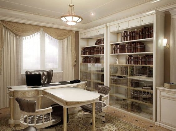 Вдоль одной из стен располагается книжный шкаф с распашными дверцами, открытыми полками и остекленными витринами. В качестве украшений для кабинета подойдут картины, старинный глобус или карты. Помимо рабочей зоны в кабинете неплохо бы организовать и место отдыха с уютным диваном, на котором можно расположиться с книгой или газетой.