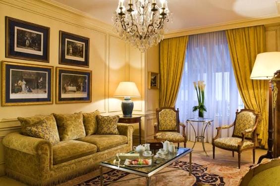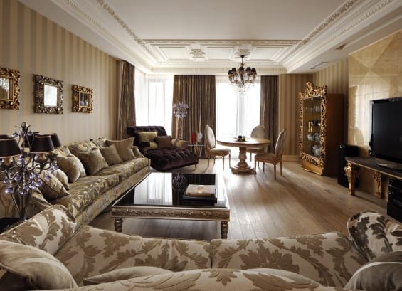 Во-вторых, спокойные нейтральные оттенки, преимущественно светлых пастельных тонов, наличие лепнины, позолоты, иногда колонн, которые придают помещению торжественность и изысканность. Большое внимание уделяется аксессуарам – это зеркала и картины в рамах, статуэтки, вазы, бронзовые подсвечники, люстры и бра с подвесками. Двери чаще филенчатые, кресла и диваны уютные с плавными линиями и подлокотниками.
