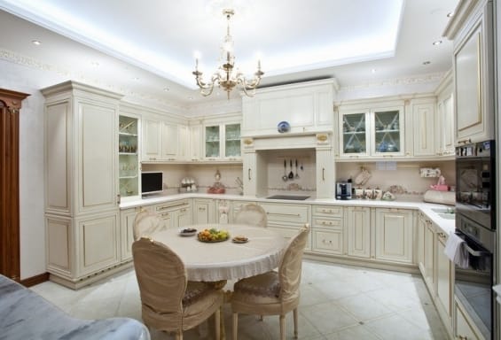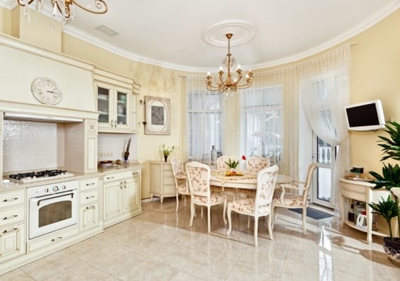 Кухня в классическом стиле необычайно уютна. Очень красивы и торжественны помещения, оформленные в белых или кремовых тонах. Большие по площади помещения можно обставить мебелью в темных тонах.