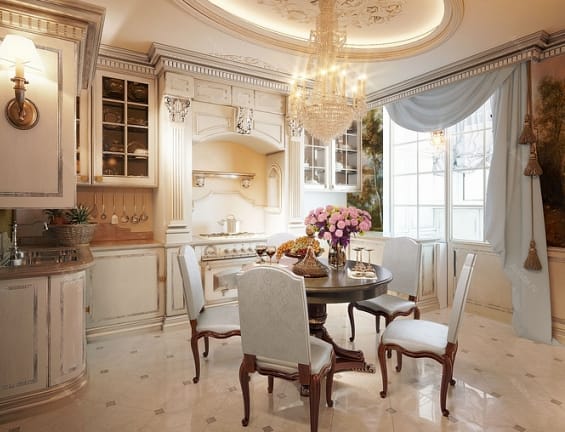 Столешницы предпочтительней выполнять из мрамора или имитации данного материала. Стол покрывают скатертью, на стульях можно встретить льняные чехлы. В целом кухня в классическом стиле эргономична, выглядит стильно и современно даже спустя 10-15 лет.