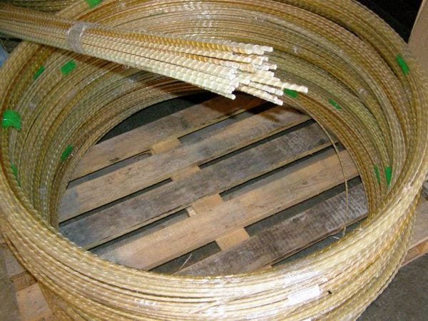 Для лучшего сцепления с бетоном на прутья наматывается тонкий шнур. Он сделан из того же самого материала, что и основной стержень. Шнур создает винтовой рельеф, как у стальной. Твердение эпоксидной смолы происходит в сушильной камере. На выходе из нее композитную арматуру немного вытягивают и нарезают. Некоторые производители до момента твердения полимера обсыпают пластиковые стержни песком для улучшения сцепления с бетоном гладких участков.