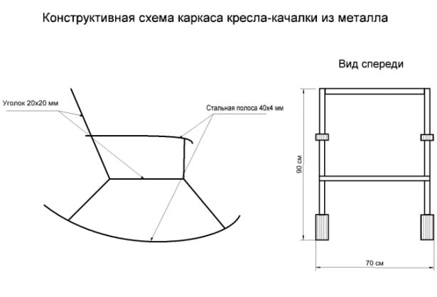 Тем, кто уверенно владеет сварочным аппаратом и болгаркой, стоит рассмотреть изготовление кресла-качалки со стальным каркасом. Для такой конструкции потребуется мелкий стальной уголок 20х20х3 мм и стальная полоса шириной 40 мм и толщиной 4 мм.
