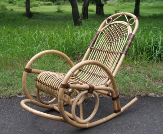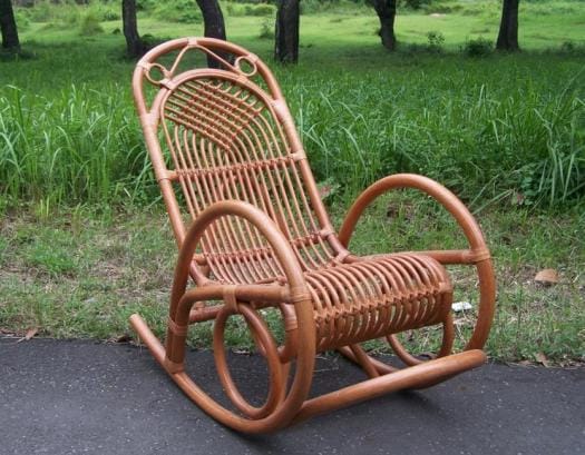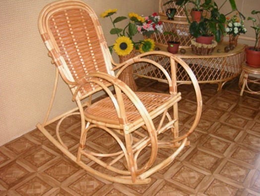 Плетеные кресла сегодня также изготавливают из ротанга – гибкой лианы, произрастающей в странах Юго-Восточной Азии. Несмотря на всю свою красоту, кресло качалка из ротанга уступает по прочности ивовой, поскольку этот материал не допускает использования соединений на шурупах и гвоздях, а только клеевой контакт и вязку.