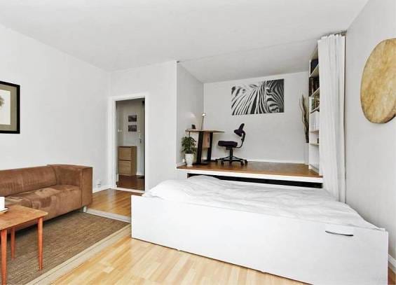 Если ваша однокомнатная квартира отличается большой площадью, то для спального места можно отвести часть помещения, отгородив его стеллажом или шкафом, соорудив многофункциональный подиум.