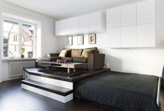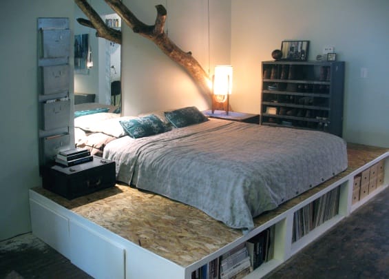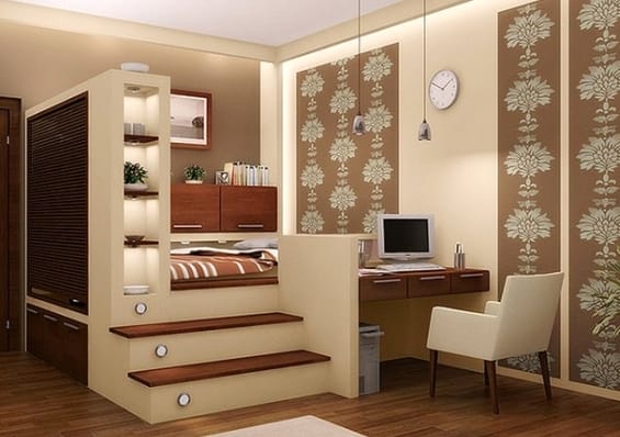 Изготовив подиум, отпадает необходимость покупки кровати как таковой и прикроватных тумбочек, что поможет вам сэкономить на приобретении части мебели для спальни.