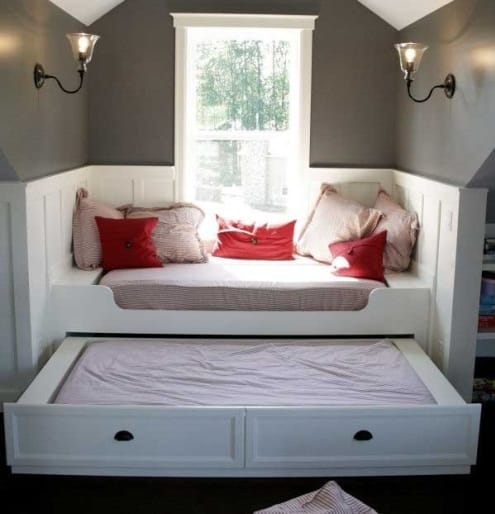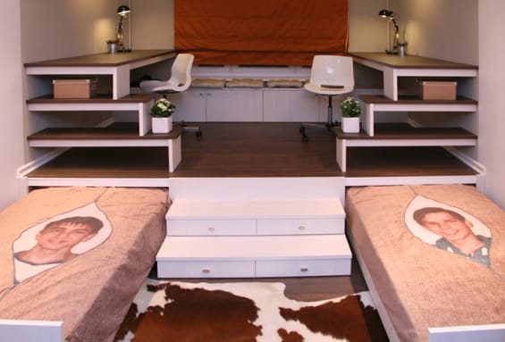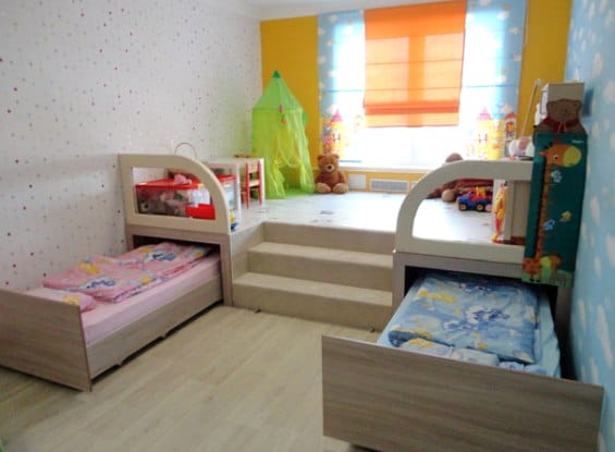 Иногда подиум выполняет функцию двухъярусной кровати, когда и на самом подиуме и внутри него размещены два спальных места. Такой вариант подойдет для комнаты двух детей, и экономит полезное пространство.