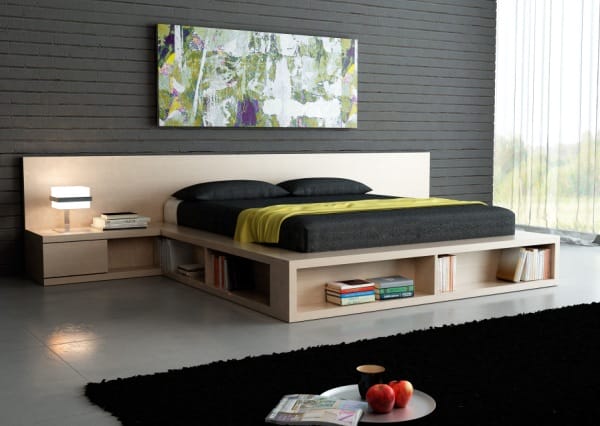 Компактный подиум, чуть шире матраса, расположенного на нем, не займет много места. В изголовье подвешена конструкция с выдвижными полками, где можно хранить книги, журналы, украшения. Такие подиумы применяют в интерьерах, решенных в восточном (японском) стиле.