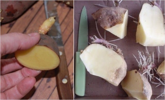 Совет! У клубня не все почки активные, поэтому нарезку на дольки лучше делать после проращивания, когда появятся небольшие росточки.